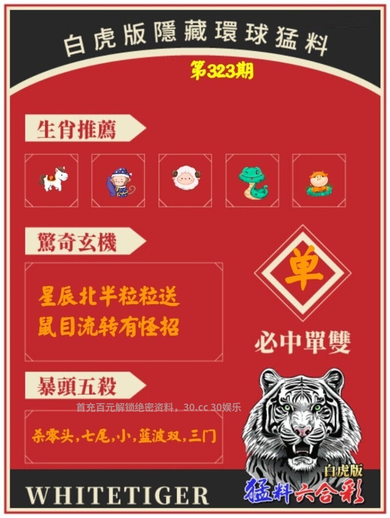 321期:白虎环球猛料 开:羊23对 双数有码蓝波定,一言九鼎是君王 解释:双数有码蓝波定,一言九鼎是君王,解羊鼠蛇马 九肖:羊鼠蛇马龙兔牛虎鸡 |