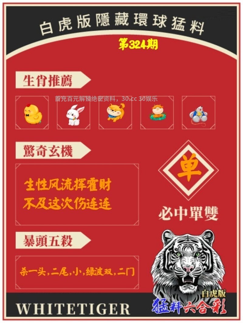 320期:白虎环球猛料 开:虎28对 小姑一人来观花,荡着秋千乐逍遥 解释:小姑一人来观花,荡着秋千乐逍遥,解虎兔狗猴 九肖:虎兔狗猴羊鼠鸡马牛 |