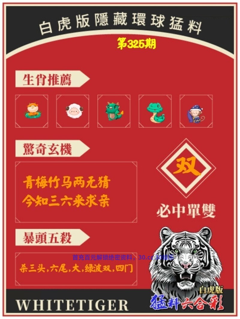 325期:白虎环球猛料 开:虎04对 青梅竹马两无猜,今知三六来求亲 解释:青梅竹马两无猜,今知三六来求亲,解牛猪虎龙 九肖:牛猪虎龙蛇鸡鼠马羊 |